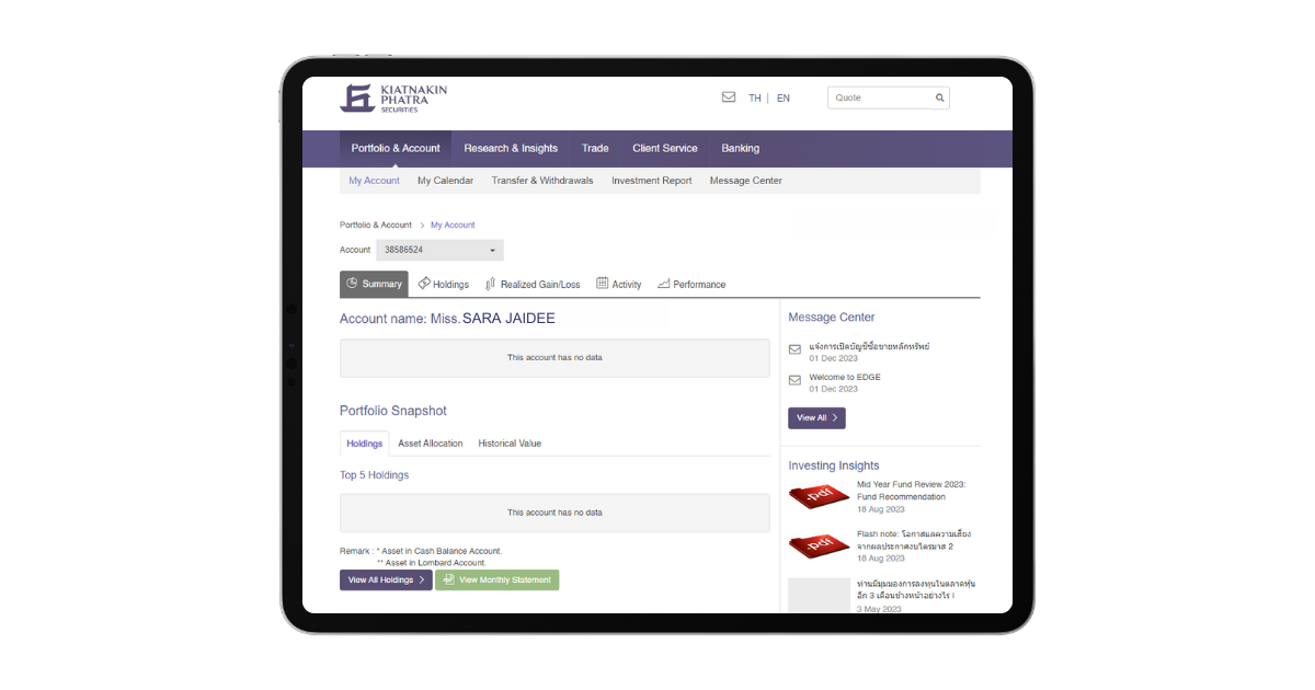 7. เมื่อทำรายการเสร็จเรียบร้อยแล้ว จะขึ้นหน้าจอเว็บไซต์ Wealth management ตามรูป
